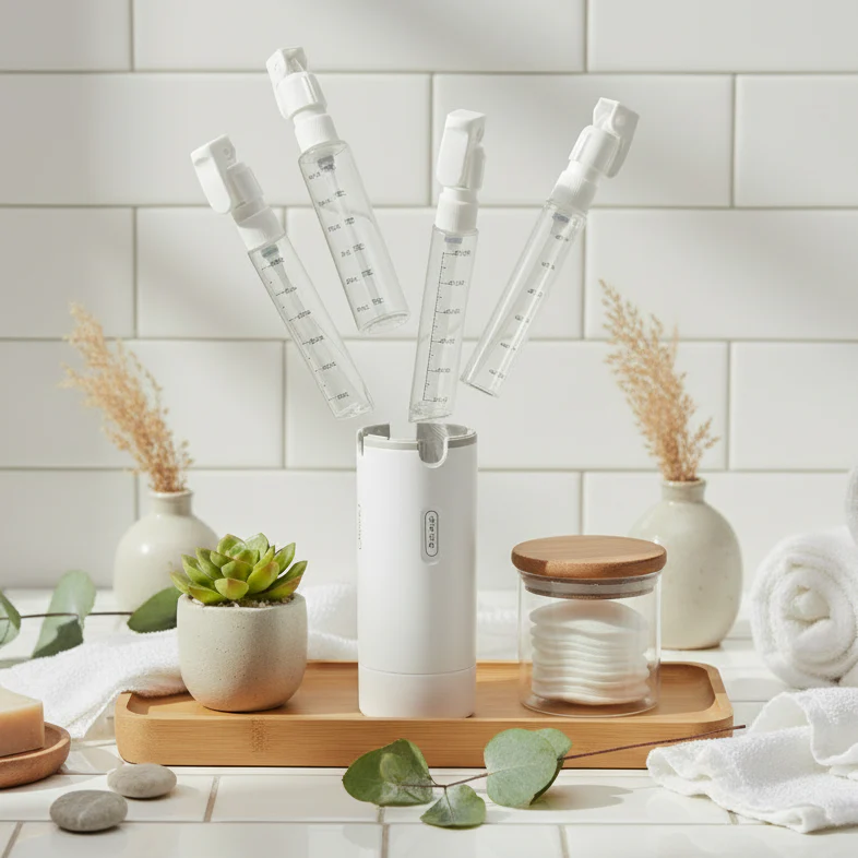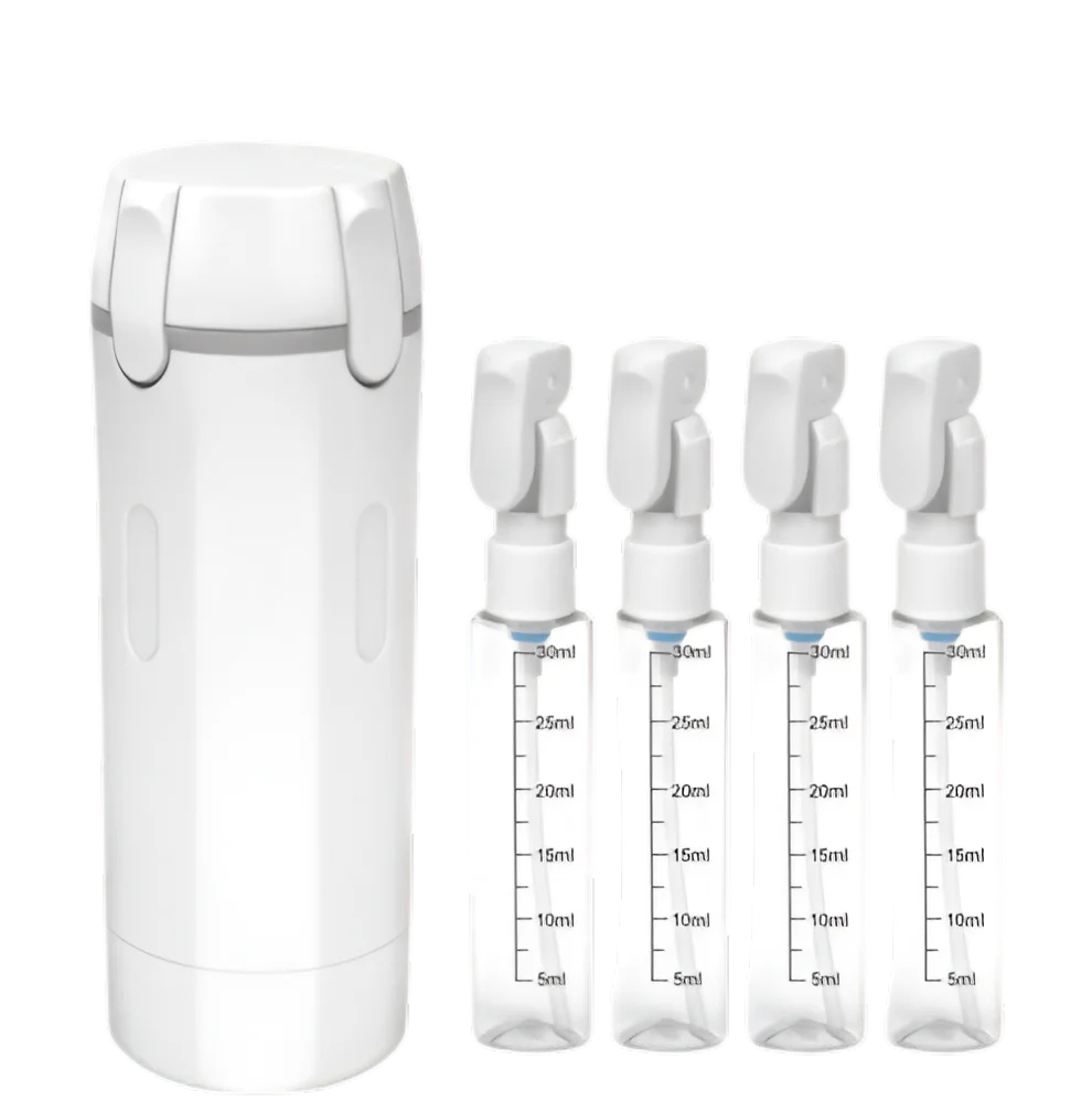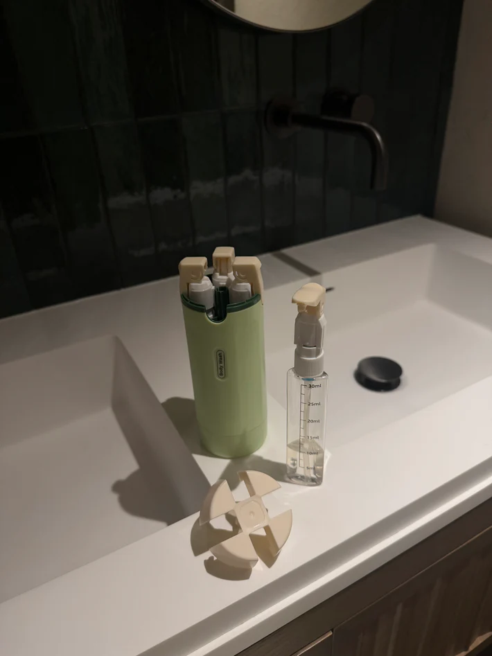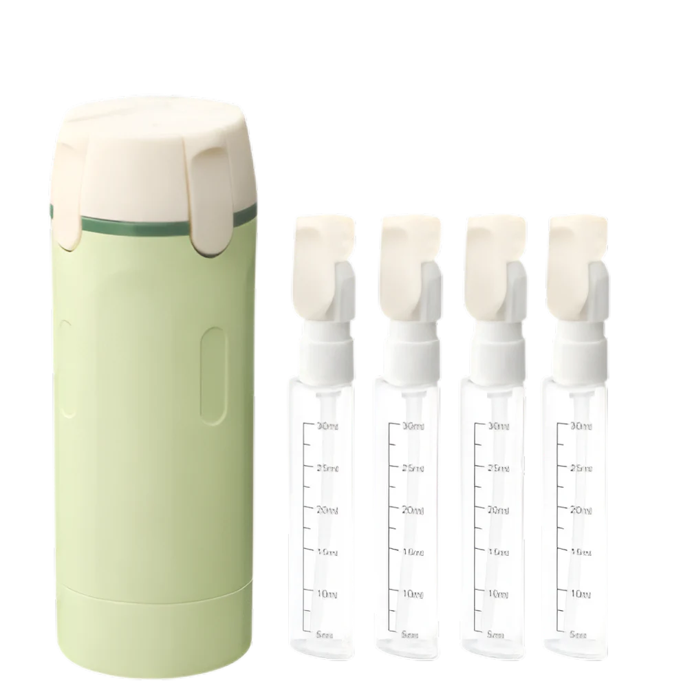 Zabierz ze sobą wszystko, czego potrzebujesz, w czterech 30-mililitrowych butelkach wielokrotnego użytku, które zmieścisz w jednym kompaktowym, szczelnym dozowniku. Zachowaj porządek, podróżuj lżej i utrzymuj swoją codzienną rutynę bez wysiłku, gdziekolwiek jesteś.
