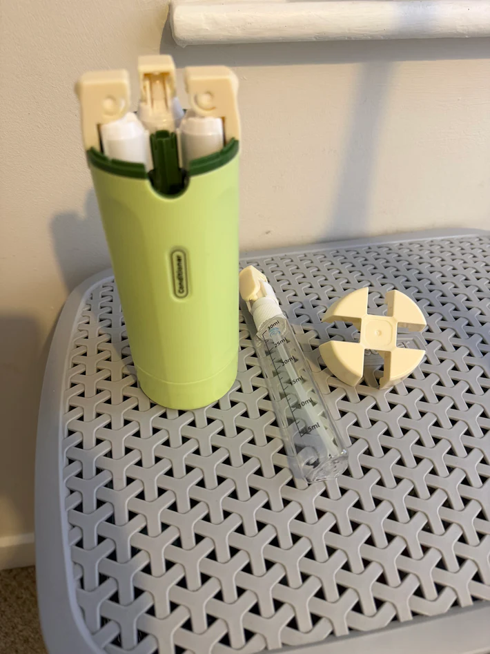 Wszystkie elementy są demontowalne, co pozwala na szybkie i higieniczne umycie buteleczek pod bieżącą wodą przed ponownym napełnieniem